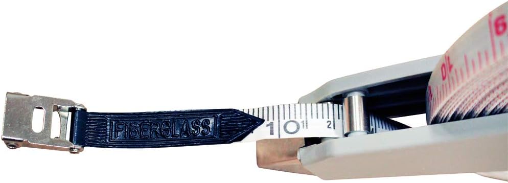 Vinyl fiberglass construction in a heavy duty polyethylene case. Open Reel Design. Features a durable hand crank for easy winding or unwinding of the measuring tape. Double sided tape shows feet on meters. Perfect for measuring a variety of fields and home run distances. Suitable for landscaping, building OR surveying.